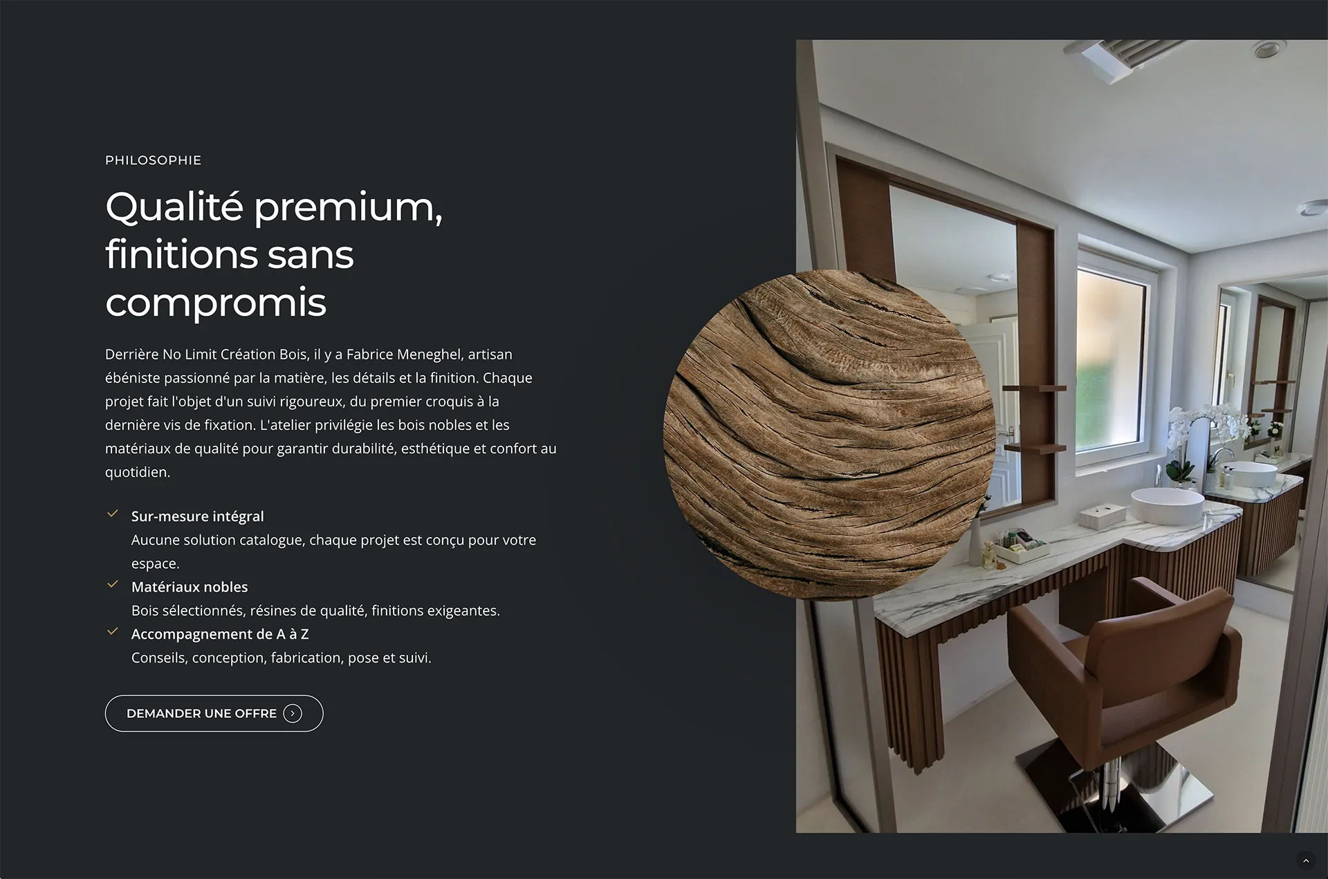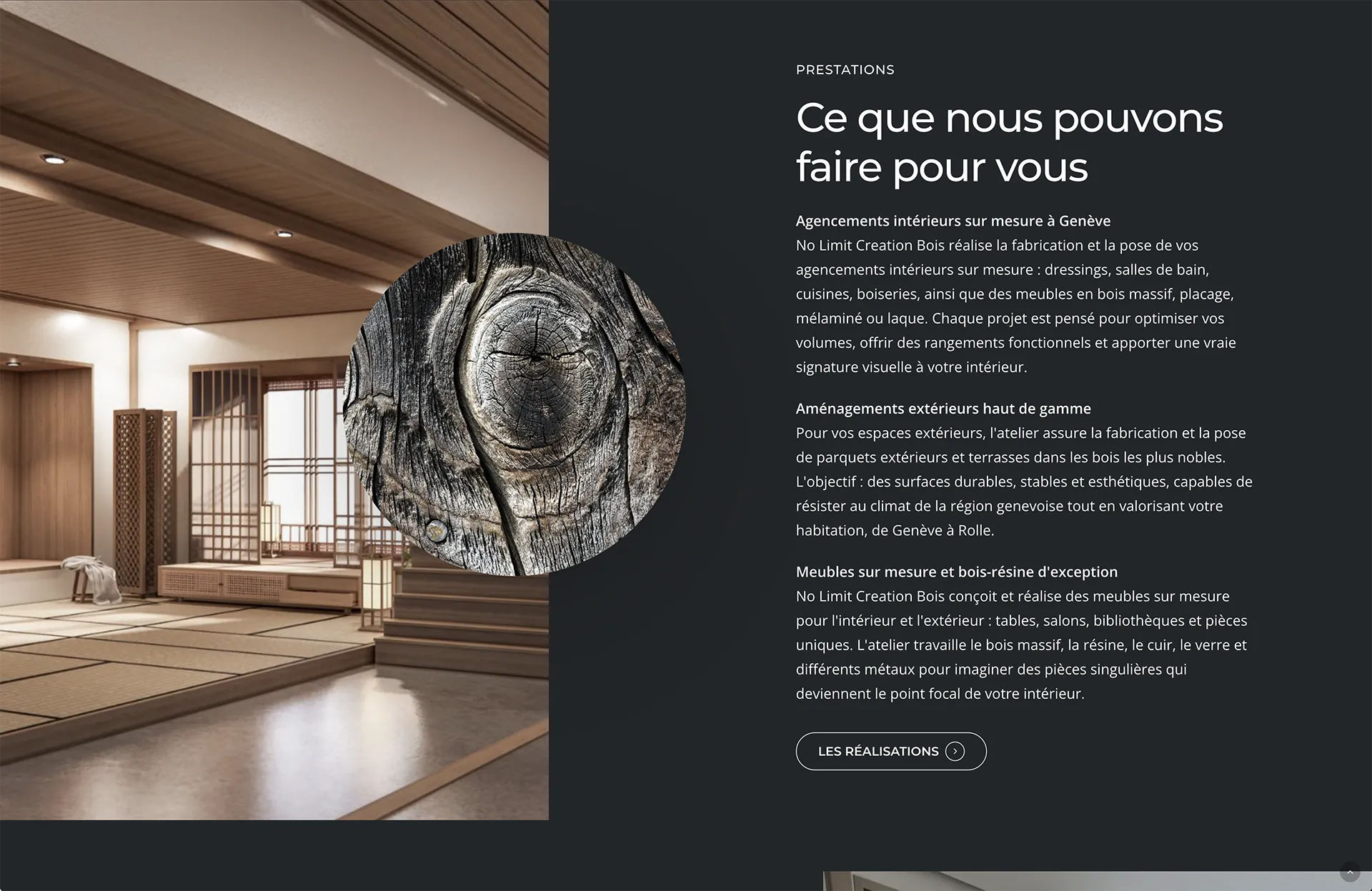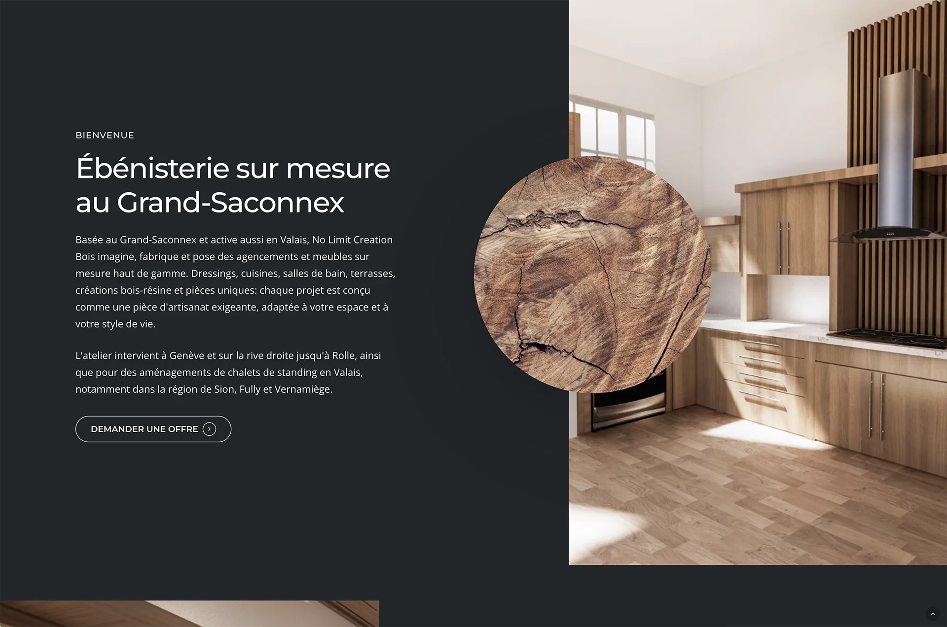 Derrière No Limit Creation Bois, il y a Fabrice Meneghel, ébéniste basé au Grand-Saconnex, actif de Genève jusqu'en Valais. Il imagine, fabrique et pose des agencements et meubles sur mesure haut de gamme : dressings, cuisines, salles de bain, terrasses, tables bois-résine et pièces uniques.