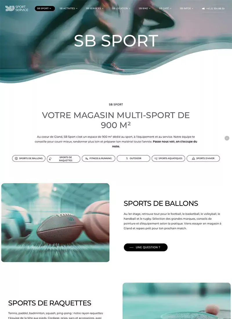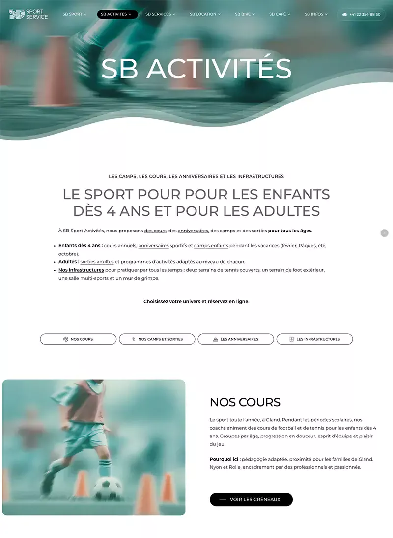 SB Sport Service est une entreprise incontournable de la région nyonnaise. Elle propose un large éventail d’activités sportives pour enfants, ados et adultes : cours, camps, anniversaires et sorties sportives. C’est Mégane Bucher, responsable passionnée et visionnaire, qui m’a confié la refonte complète de leur site internet.